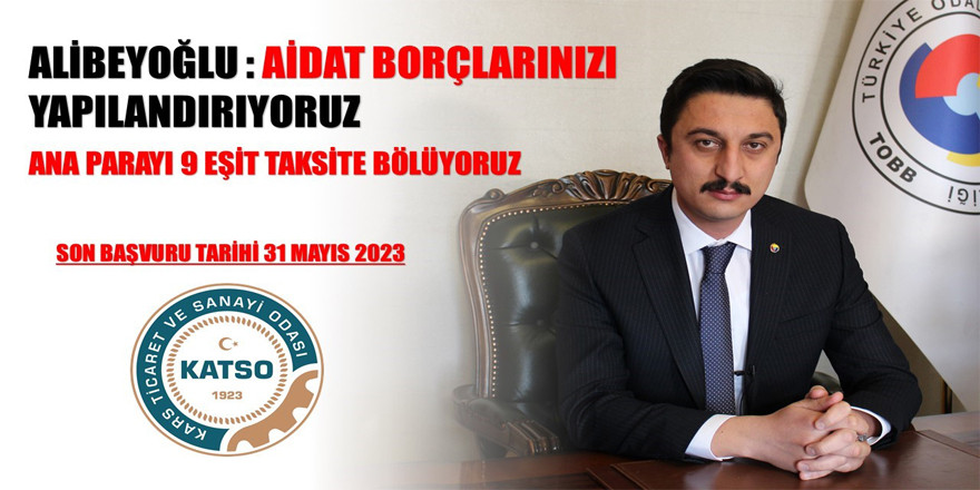 Kars Ticaret ve Sanayi Odası (KATSO) Başkanı Ertuğrul Alibeyoğlu, geçmiş dönem aidat borçlarının gecikme zamlarının tamamının af kapsamında yer aldığını belirterek, "Yapılandırmadan yararlanmak isteyen üyelerimiz 9 taksite kadar anaparayı taksitlendirebilecek" dedi.