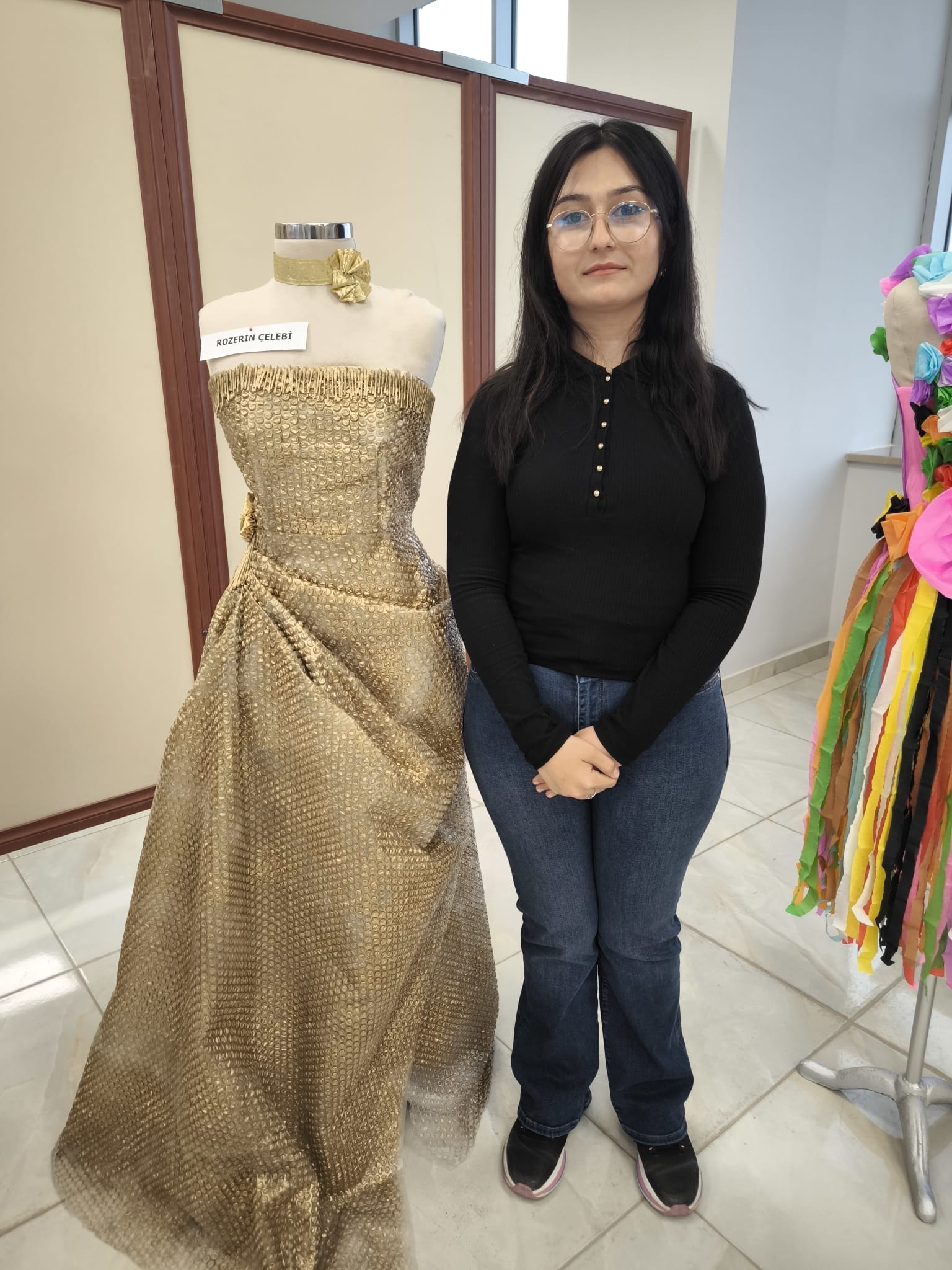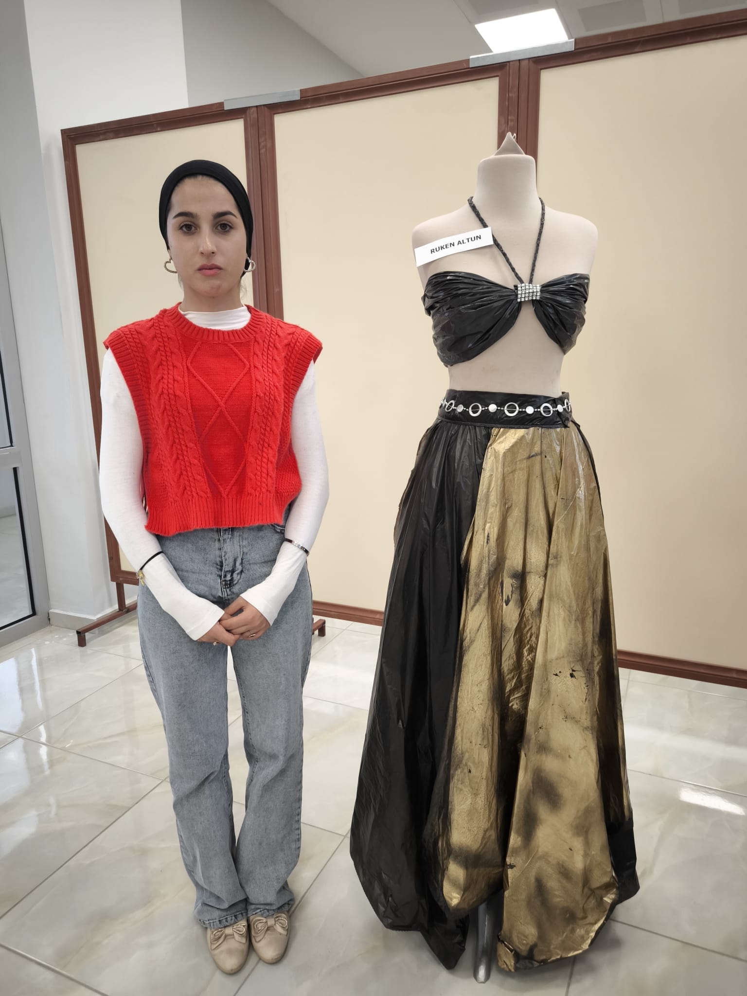 Çöp poşeti ve alüminyum folyo ile giysi tasarlayan Hayrunisa Çakarız ise, "Geri dönüşüm deyince aklıma ilk gelen şey çöp poşeti olduğu için ve geri dönüşüm deyince herhangi bir masraf çıkmaması için direkt elimdeki çöp poşeti ve alüminyum folyoyu kullandım. Önce beden kalıbını oluşturduktan sonra alüminyum folyo ile üstünü kaplayıp çöp poşetinden pile deseni verdim. Üstüne de özel günlerde verilen çiçekler olur, güller olur, onlar çöpe gitmemesi için üstüne de gül detaylarından süslemeler yaptım." diye konuştu.